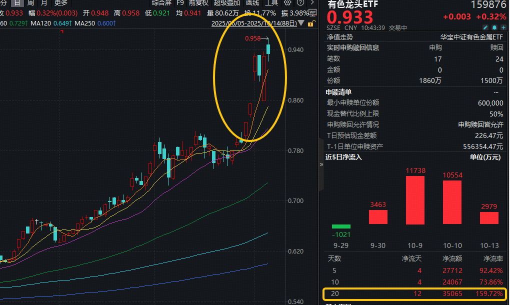值得关注的是,资金积极抢筹!截至发稿,有色龙头ETF(159876)获资金实时净申购360万份!深交所数据显示,该ETF近4日连续吸金,合计金额2.97亿元。截至10月13日,有色龙头ETF(159876)最新规模6.35亿元,创历史新高。