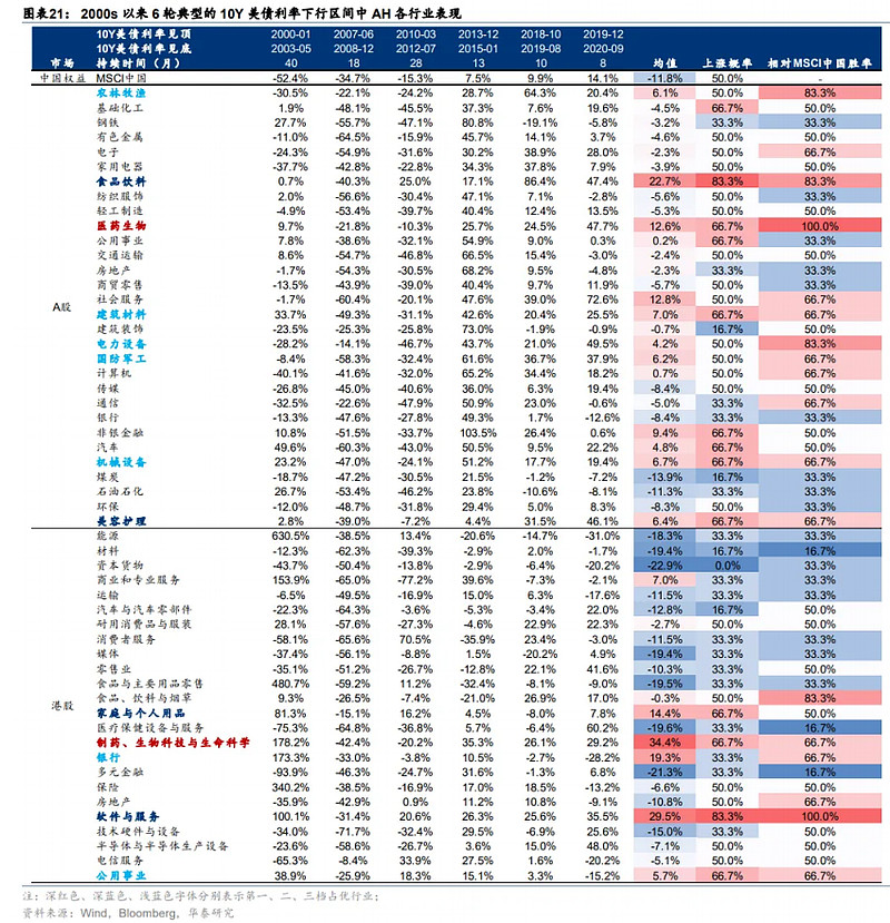 资金来了,会去哪?华泰证券统计了2000年以来6轮10年期美债利率下行期间,AH各行业的表现情况。