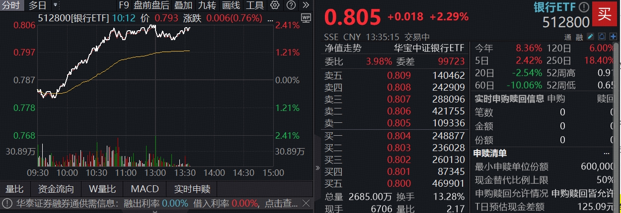 ETF盘中资讯|防御风格再起,银行乘势而上!百亿银行ETF(512800)涨逾2%,连续4日吸金逾18亿元