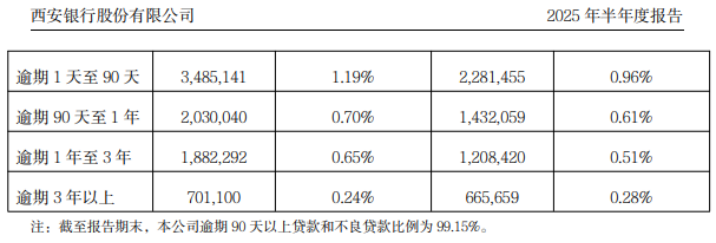 证券之星注意到,逾期贷款的增长作为当前风险的直接体现,西安银行上半年的重组贷款和逾期贷款情况值得注意。截至2025年上半年,西安银行逾期贷款金额达到了80.99亿元,较2024年末的55.88亿元整体增长44.94%,其中逾期1-90天的短期贷款增幅最大。