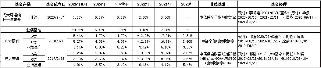 ②排名数据及分类来源自银河证券,截至2025/9/30。光大中高等级近1/2/3/4年同类排名分别为1/266、1/239、1/211、1/194。光大添益A近3/5/7年排名分别为20/338、3/226、2/174,同类为普通债券型基金(二级)。光大增利A近1/3/5/7/10年同类排名分别为13/266、13/211、7/185、10/132、7/84,同类为普通债券型基金(可投转债)。光大晟利、光大安诚、光大尊裕近一年排名分别为9/266、21/499、58/665,同类分别为普通债券型基金(可投转债)、普通债券型(二级)、定开纯债债券型基金