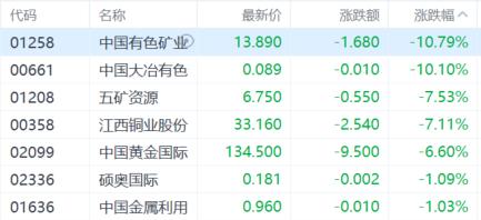 铜业股走弱,中国有色矿业、中国大冶有色跌超10%,五矿资源、江西铜业股份跌超7%,中国黄金国际跟跌。