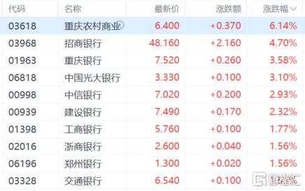 内银股震荡走高,重庆农村商业银行涨超6%,招商银行涨超4%,重庆银行、中国光大银行涨超3%,中信银行、建设银行等跟涨。