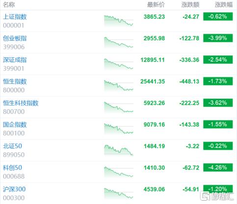港A股大跳水。科创50收跌超4%,创业板指跌3.99%、深证成指跌2.54%,沪指、北证50、沪深300均纷纷走低。