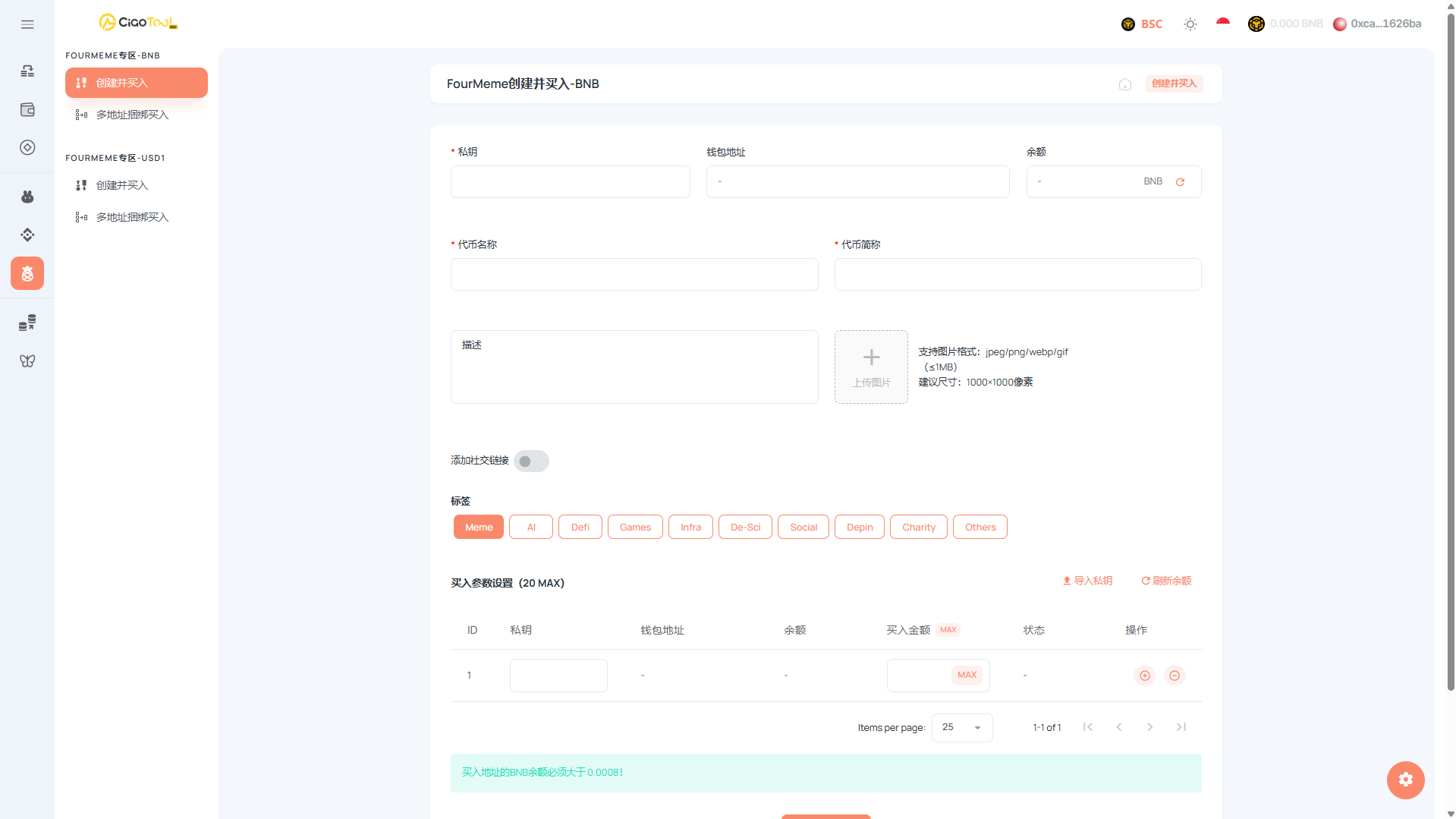 1.打開 CiaoTool → FourMeme 專區 → 點擊「創建代幣並捆綁買入」