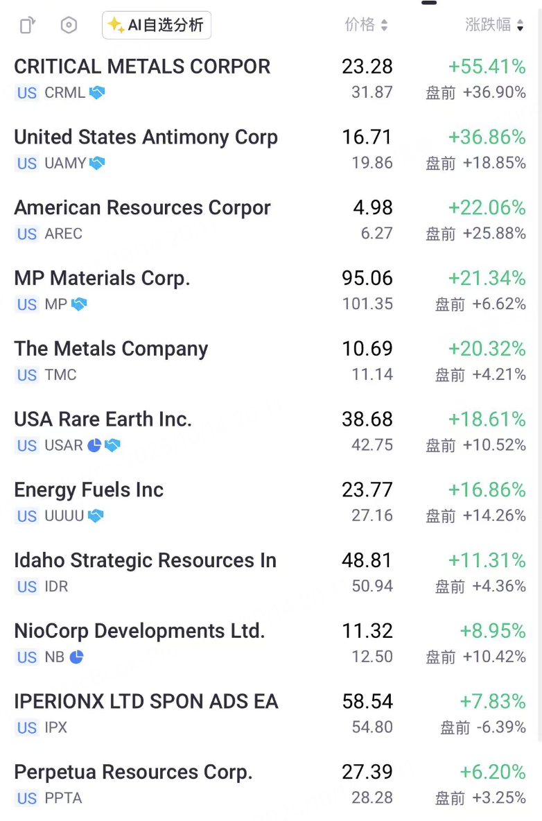 过去两年,很多人以为资源股的故事已经讲完了。锂泡沫破了,钴被边缘化,铜涨得磕磕绊绊,连黄金这么大的逻辑都得靠美联储降息来救场。但就在这片哀鸿遍野中,稀土却突然活了过来——美股稀土概念股集体暴涨,港股磁体龙头走出独立行情,市场开始重新审视这类“看起来冷门,实际上卡脖子”的小金属。