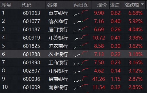 今日银行再度走强,成为支撑大盘的主力。截至收盘,A股42只银行股全线飘红,超半数个股涨逾2%,城农商行表现亮眼,重庆银行领涨6.68%,渝农商行涨近6%,厦门银行涨超4%,农业银行、工商银行等涨超3%。