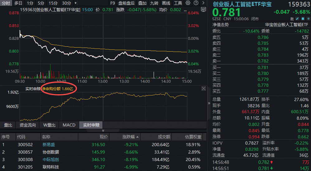 热门ETF方面,同类规模最大、流动性突出的创业板人工智能ETF(159363)全天单边下跌,场内价格回调5.68%创近1个月新低,全天成交额超10亿元。资金大跌大买,单日净申购1.66亿份。