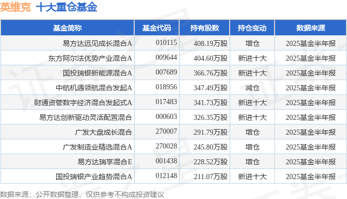 持有英维克最多的基金为易方达远见成长混合A,目前规模为14.9亿元,最新净值1.6575(10月14日),较上一交易日下跌5.2%,近一年上涨87.21%。该基金现任基金经理为武阳。