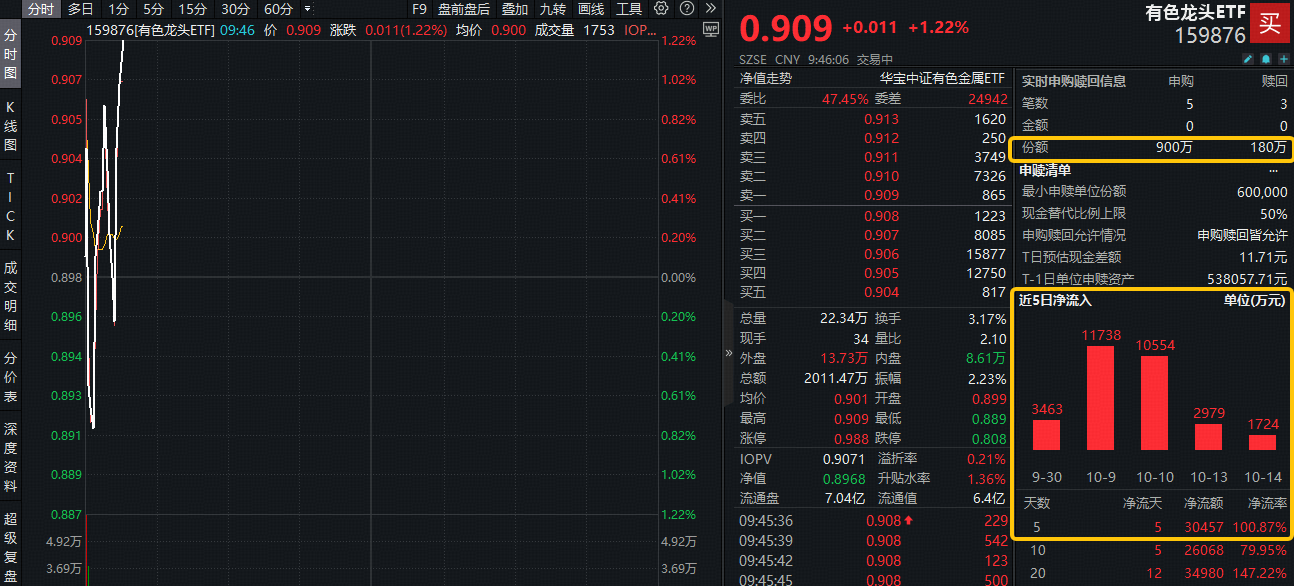 盘面上,今日(10月15日)揽尽有色金属行业龙头的有色龙头ETF(159876)继续上攻,场内价格现涨1.22%,截至发稿,获资金实时净申购720万份!深交所数据显示,有色龙头ETF(159876)近5日连续吸金,合计金额3.05亿元。反映资金看好板块后市,积极进场抢筹!