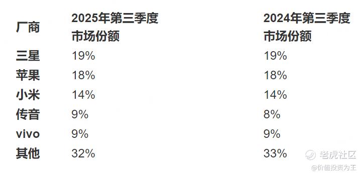 今年三季度,全球智能手机出货量回暖,同比增长3%,三星在Galaxy A系列以及第7代 折叠屏产品销量稳定增长支撑下,以19%的市场份额连续第三个季度夺得头把交椅: