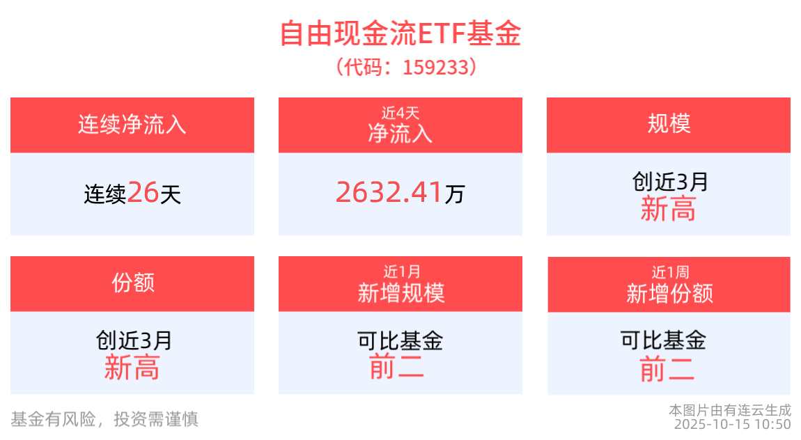 从资金净流入方面来看,自由现金流ETF基金近26天获得连续资金净流入,最高单日获得1919.27万元净流入,合计“吸金”1.75亿元,日均净流入达674.01万元。
