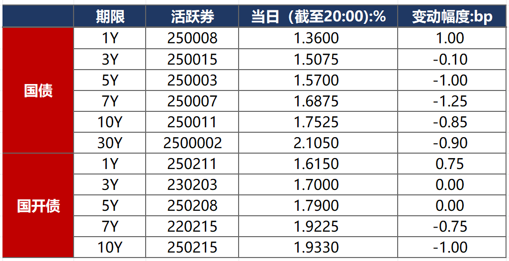 10月14日,受股市下跌,资金面宽松,以及贸易摩擦不确定性提振,债市有所修复。截至北京时间20:00,10年期国债活跃券250011收益率下行0.85bp至1.7525%,10年期国开债活跃券250215收益率下行1.00bp至1.9330%。