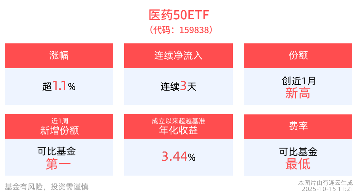 截至2025年10月15日 11:21,中证医药50指数强势上涨1.16%,成分股华海药业上涨7.54%,兴齐眼药上涨5.89%,海思科上涨4.87%,神州细胞,艾力斯等个股跟涨。医药50ETF(159838)上涨1.13%,最新价报0.63元。拉长时间看,截至2025年10月14日,医药50ETF近3月累计上涨8.36%。