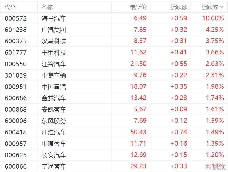 A股市场上,海马汽车封板涨停,广汽集团涨4.25%,江铃汽车涨超2%,安凯客车、江淮汽车、长安汽车跟涨。