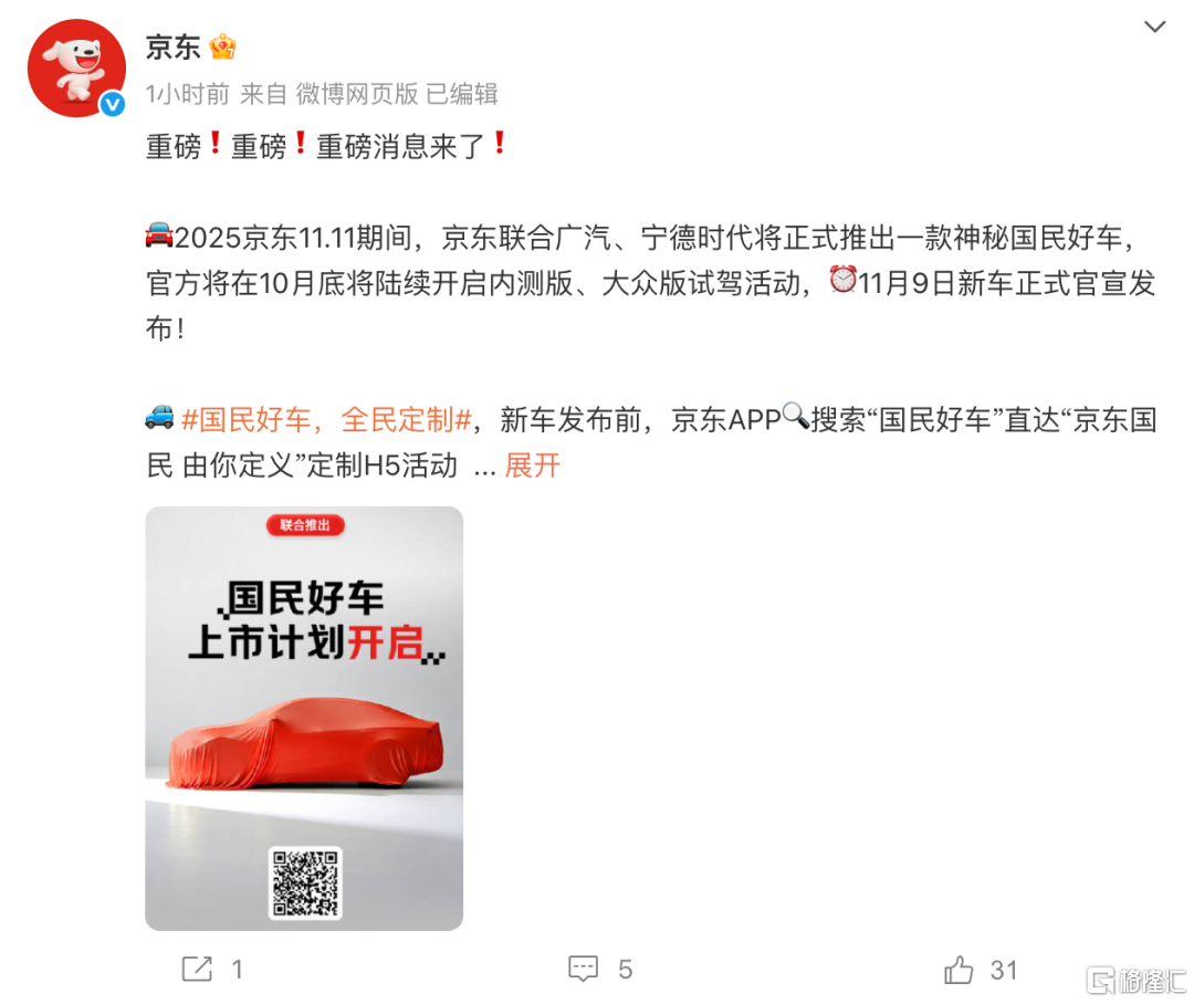 10月14日,京东在微博官宣联合广汽、宁德时代将推出一款汽车,将在10月底陆续开启内测版、大众版试驾活动,11月新车正式官宣发布。