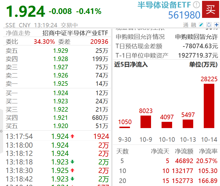 但在这几天的调整中,资金通过ETF“越跌越买”,半导体设备ETF(561980)昨天净申购超过2.8亿元,明显放量。