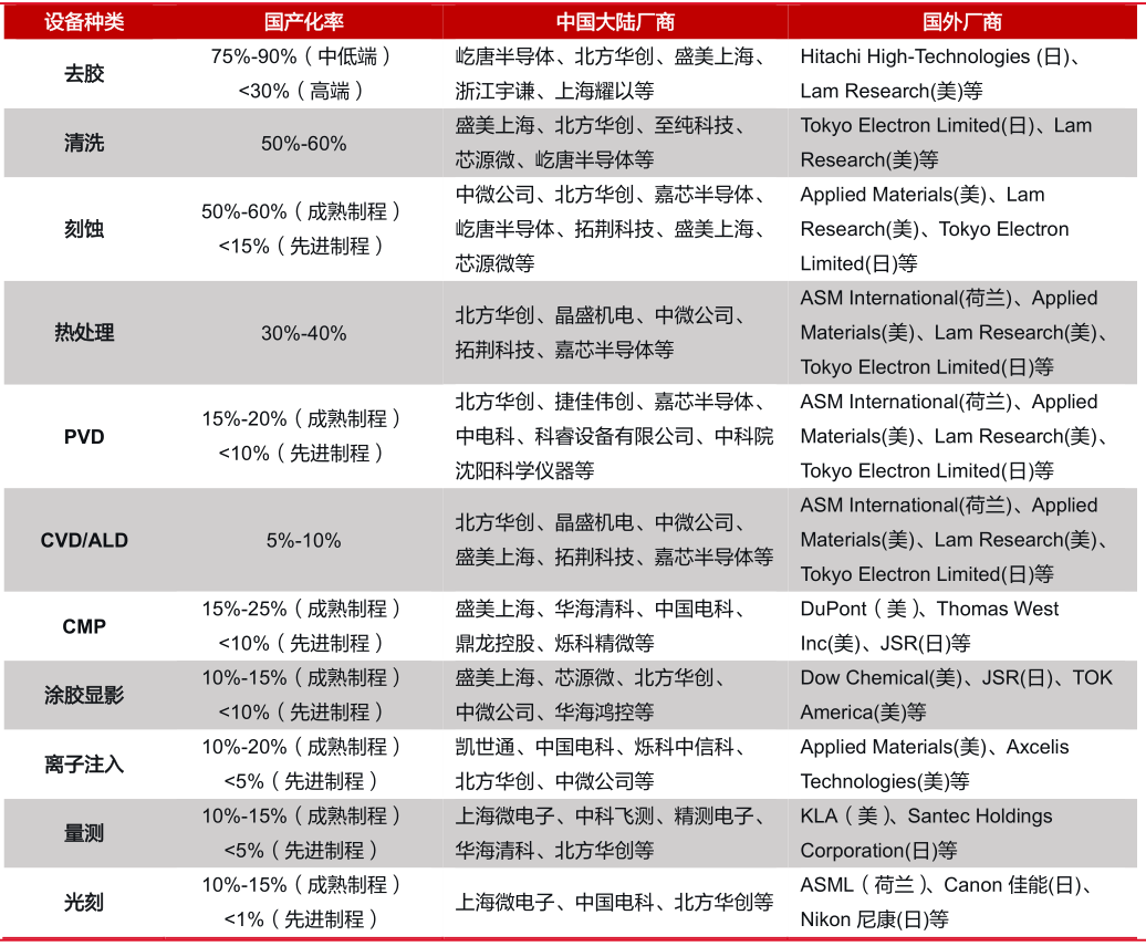 半导体设备国产化率及对应国内外厂商