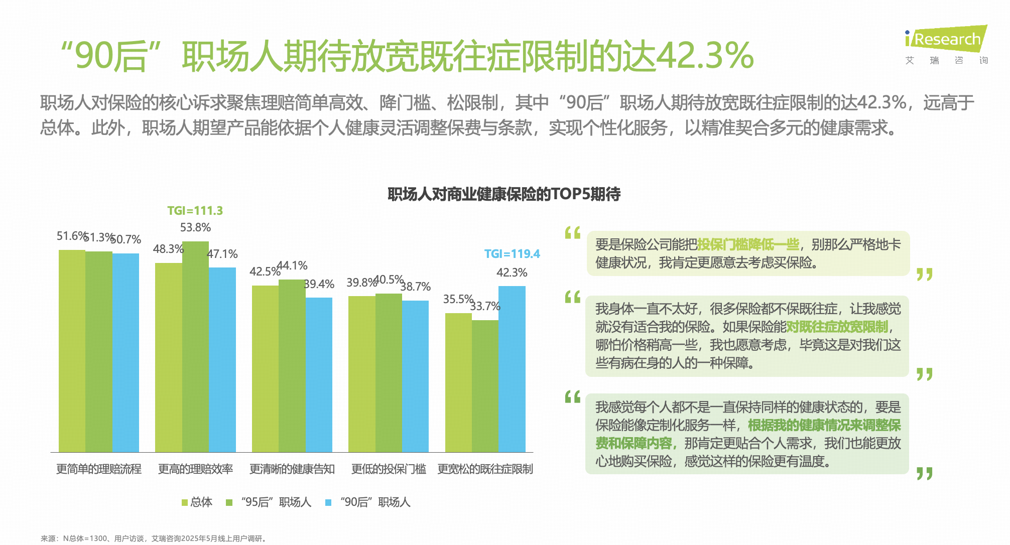 带病体保险市场正迎来历史性机遇,满足职场人特别是带病体人群的健康保障需求,将成为行业新增长点。只有切实解决带病群体"产品少、投保难、条款复杂"等痛点,才能实现保险保障的普惠价值。《白皮书》数据也显示,"90后"职场人期待放宽既往症限制的达42.3%。