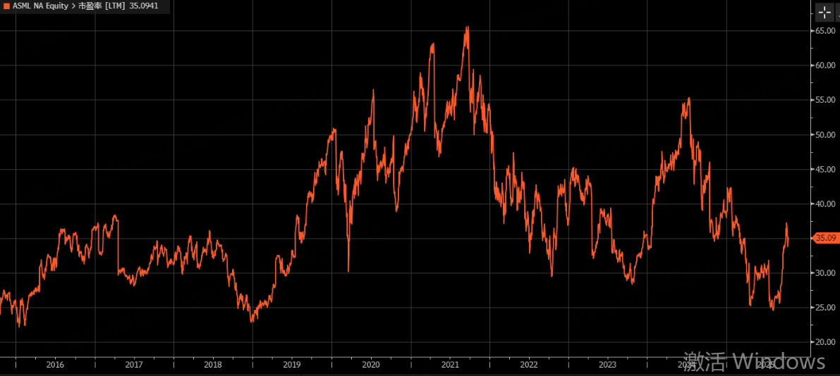 总的来说,阿斯麦靠着垄断地位,独享AI红利,这点毋庸置疑。从估值上看,阿斯麦市盈率较历史估值不算太高: