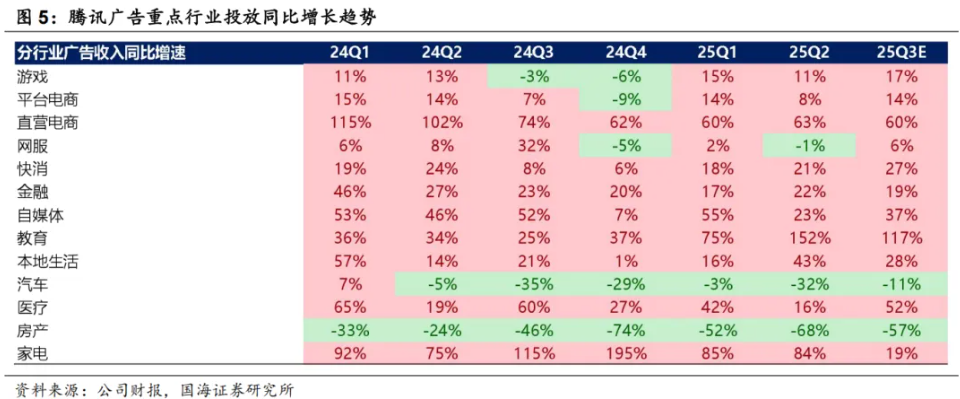 国海预计2025Q3营收同比增长22%,腾讯依托内容生态和AI能力的协同强化,广告投放效率与转化率进一步提升,带动广告业务实现强劲增长。
