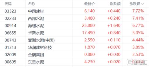 建材水泥股走高,中国建材、西部水泥涨超7%,海螺水泥、华新水泥、亚洲水泥(中国)、华润建材科技等跟涨。