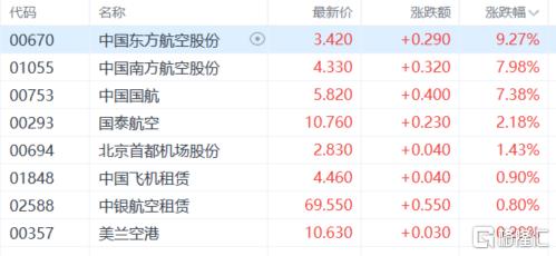 航空股拉升,中国东方航空股份涨超9%,中国南方航空股份、中国国航涨超7%,国泰航空、北京首都机场股份等跟涨。