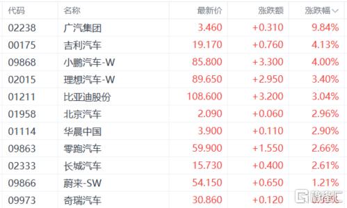 汽车股拉升明显,广汽集团涨近9%,吉利汽车、小鹏汽车、理想汽车、比亚迪股份、北京汽车等跟涨。