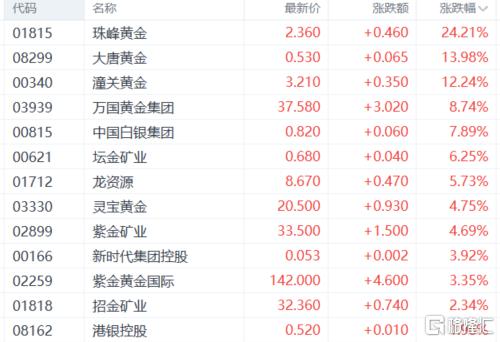 黄金股走强,珠峰黄金涨超24%,大唐黄金、潼关黄金、万国黄金集团、中国白银集团、紫金矿业等跟涨。