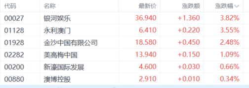 濠赌股终见反弹,银河娱乐、永利澳门涨超3%,金沙中国有限公司、美高梅中国、新濠国际发展、澳博控股等跟涨。