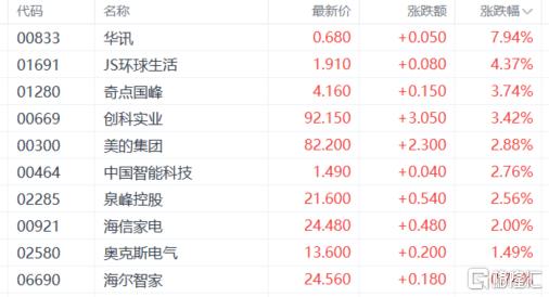 家电股上涨,奇点国峰涨超3%,创科实业、美的集团、中国智能科技、泉峰控股、海信家电等跟涨。