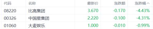 影视股下挫,比高集团、中国星集团跌超4%,大麦娱乐跌近1%。