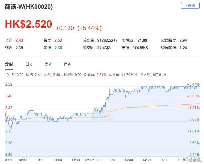 商汤涨超5%,报2.52港元,总市值达到974.59亿港元。
