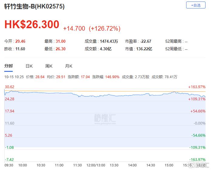 由四环医药分拆的轩竹生物今日首日上市,大涨126.72%,报26.3港元。