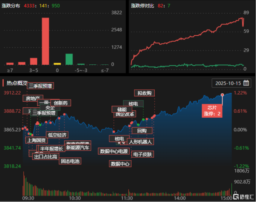 10月15日,沪指涨1.22%重回3900点,深成指涨1.73%,创业板指涨2.36%。沪深两市成交额2.07万亿,较上一个交易日缩量5034亿。汽车、电网设备、医药等板块涨幅靠前,港口航运、光刻机、转基因等下跌。