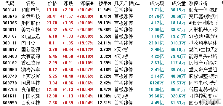 焦点股方面,上海微电子概念股华建集团9天5板,零售板块国光连锁3连板,低价股大有能源4天3板、渤海汽车6天3板,可控核聚变概念股中国核建5天3板。