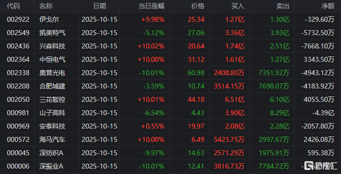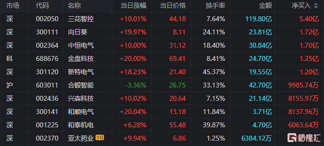 龙虎榜单日净买入额前三为三花智控、向日葵、中恒电气,分别为5.40亿元、1.72亿元、1.70亿元。