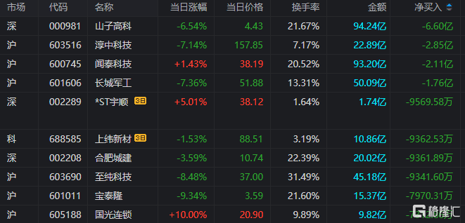 龙虎榜单日净卖出额前三为山子高科、淳中科技、闻泰科技,分别为6.60亿元、2.85亿元、2.11亿元。