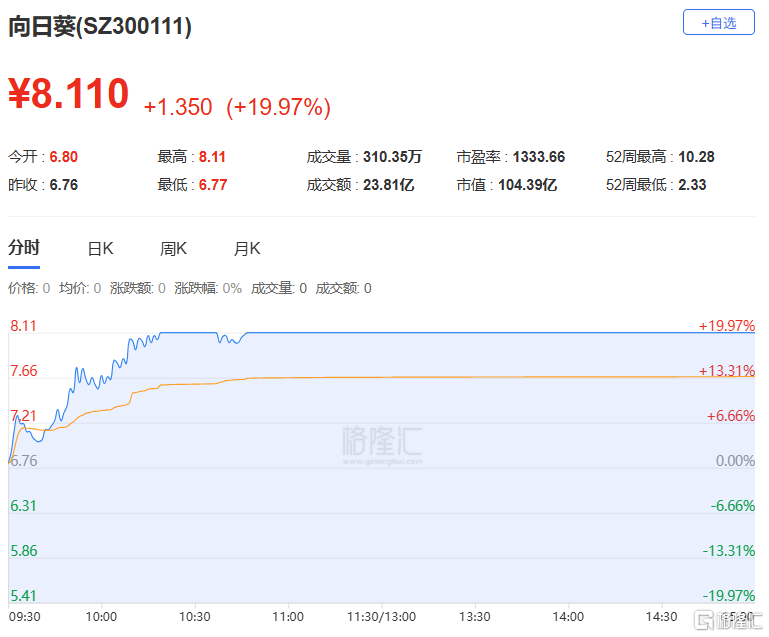 向日葵:今日涨停,换手率24.11%,成交额23.81亿元。龙虎榜中,机构净买入1.31亿元。