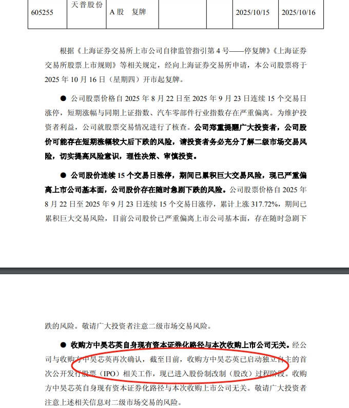 在此之前,天普股份已经因股票交易异常波动三次停牌核查。其中,天普股份自2025年8月22日至9月3日连续9个交易日涨停被停牌核查,于2025年9月9日公告核查结果并复牌;复牌后自2025年9月9日至9月10日连续2个交易日涨停,再次触及股票交易异常波动,并第二次被停牌核查,于2025年9月18日公告核查结果并复牌。