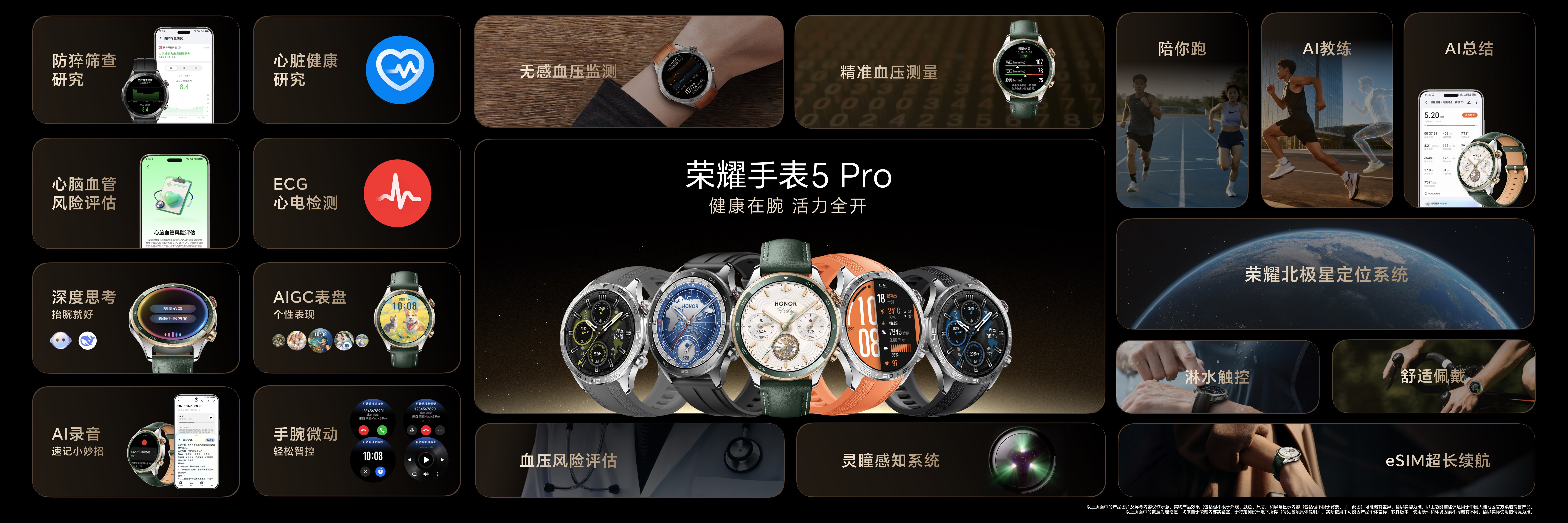 2025年10月15日,“开新局,见未来” 荣耀Magic8系列暨MagicOS10发布会重磅举行,正式发布荣耀MagicPad3 Pro、荣耀手表5 Pro等全场景旗舰新品。发布会上,荣耀推出旗舰级智能手表新品荣耀手表5 Pro,集高端材质、极致工艺、全面健康管理、AI专业跑步于一身,为用户提供从健康监测管理到运动指导监测的全场景智能体验升级,是同档位智能运动手表中首款支持全天无感血压监测的产品。荣耀手表5 Pro将于10月23日全渠道正式开售,国补优惠价1359.2元起。