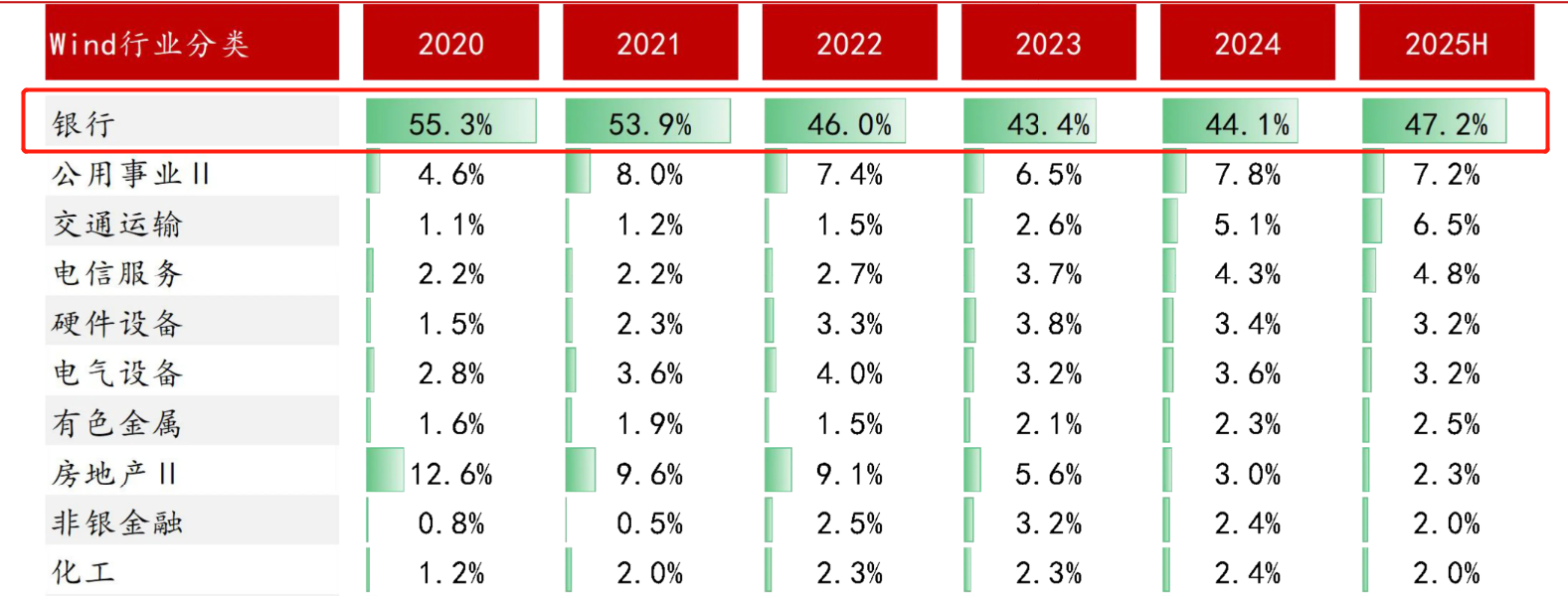 在险资持仓中,银行业占比始终最高。根据中泰证券统计,2025年上半年为47.2%,其次为公用事业、交通运输,占比分别为 7.2%、6.5%;相比2024年底持仓占比进一步提升3.1pct。