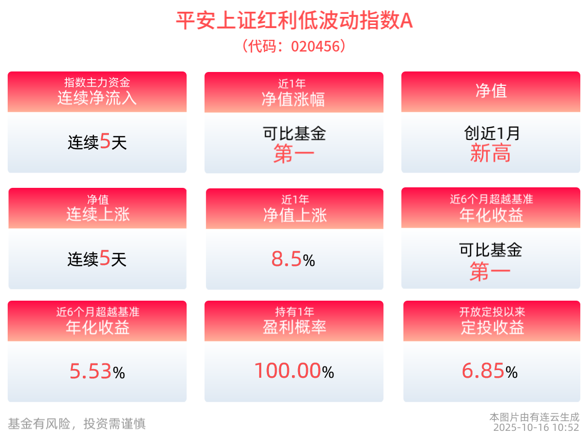 截至2025年10月15日,平安上证红利低波动指数A(020456)近6个月超越基准年化收益为5.53%,排名可比基金1/2。