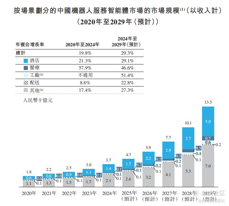 中国机器人服务智能体行业正处于高速增长阶段,市场规模与渗透率均有巨大提升空间。以收入计,中国机器人服务智能体市场规模从2020年的人民币18亿元增至2024年的人民币37亿元,年复合增长率19.8%,并预计2029年市场规模将达人民币135亿元,2024年至2029年复合增长率升至29.3%,增速显著高于整体机器人行业。细分场景中,酒店场景为最大板块,2024年市场规模人民币14亿元,预计2029年达人民币50亿元,复合增长率29.1%;医疗场景增长更为迅猛,2020年至2024年复合增长率57.9%,预计2024年至2029年仍将保持46.6%的高增速;工厂场景作为新兴领域,2024年市场规模人民币0.75亿元,预计2029年达人民币6亿元,复合增长率51.4%,成为未来重要增长极。从总目标市场来看,2024年中国机器人服务智能体总目标市场规模约人民币9382亿元,其中酒店场景占4202亿元(软件需求502亿元、硬件需求3699亿元),市场潜力巨大。