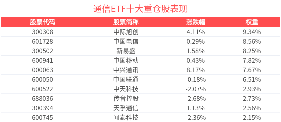 数据显示,截至2025年9月30日,国证通信指数前十大权重股分别为中际旭创、新易盛、中兴通讯、中国电信、中国移动、中国联通、天孚通信、中天科技、传音控股、亨通光电,前十大权重股合计占比66.02%。