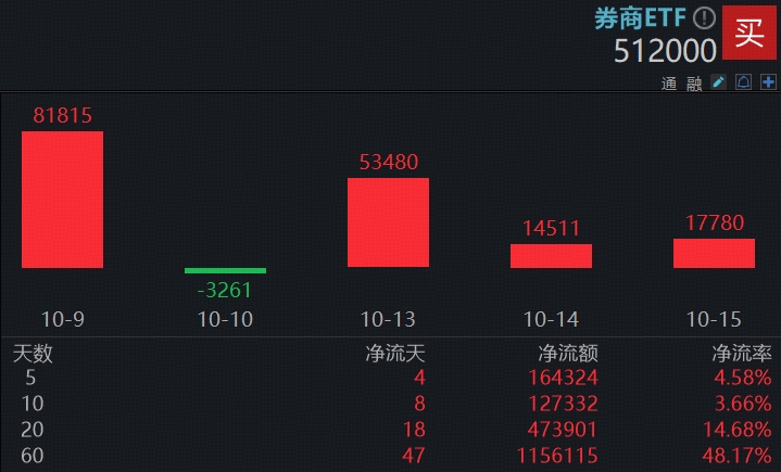 值得注意的是,券商板块的高确定性吸引资金持续涌入。上交所数据显示,券商ETF(512000)近5日有4日获资金增仓,合计达16.43亿元