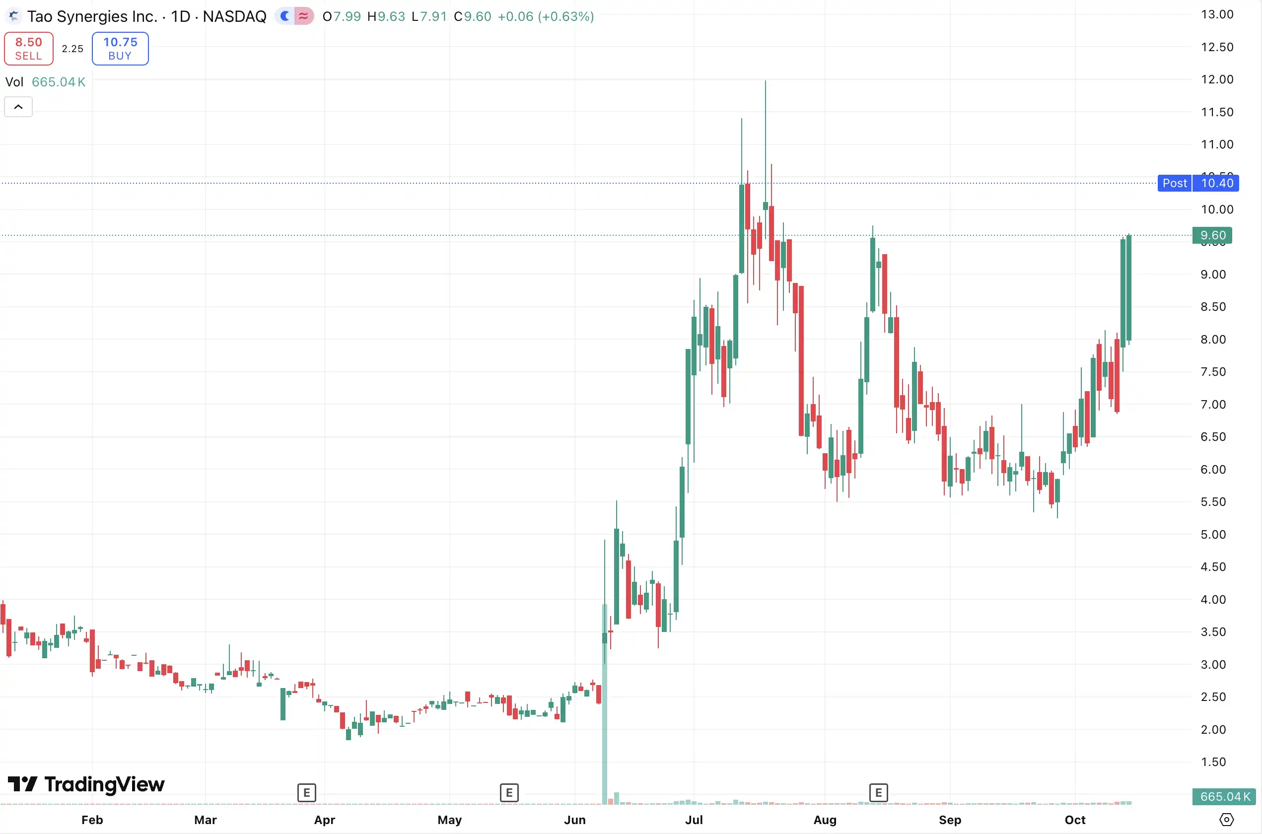 10 月 14 日,美股上市公司 TAO Synergies Inc.(纳斯达克代码:TAOX)宣布完成一项总额 1100 万美元的私募融资,投资方包括 TAO 策略顾问 James Altucher,以及 Bittensor 的早期支持者 Digital Currency Group(DCG)。
