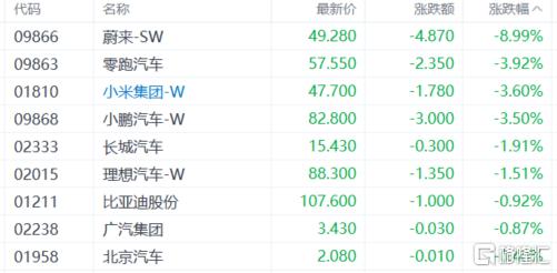 新能源车企股低迷,蔚来跌近9%,零跑汽车、小鹏汽车、长城汽车、理想汽车、比亚迪股份等跟跌。