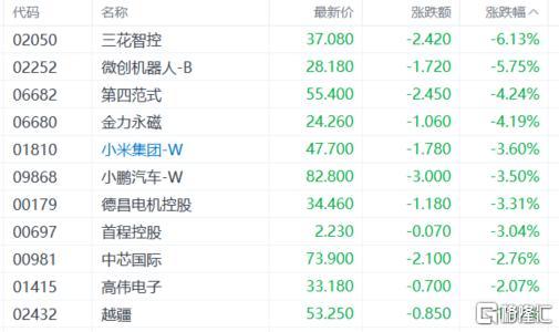 机器人概念股下挫,三花智控跌超6%,微创机器人、第四范式、金力永磁等跟跌。