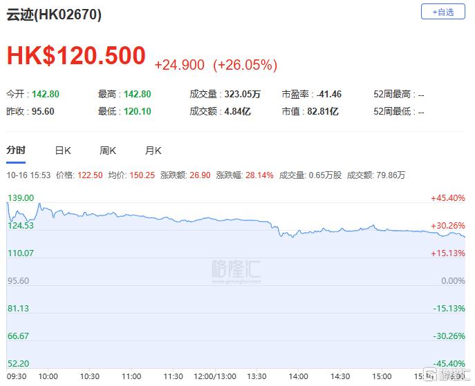 云迹今日首日在港上市,收涨26.05%,报120.5港元,最新市值82.81亿港元。